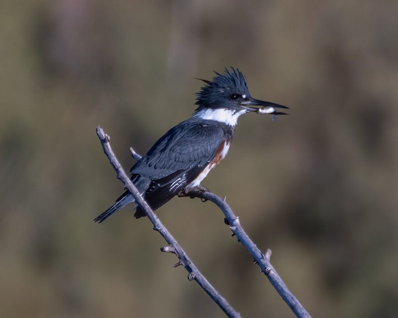 Belted Kingfishers are active hunters. They may make a hunting flight from one perch and return to the same perch, but often they will fly to very distant hunting spots after each hunting foray. With the water receding at El Rio, the fish were not spread out far making one particular tree with multiple perch spots a bit more useful for this Kingfisher.