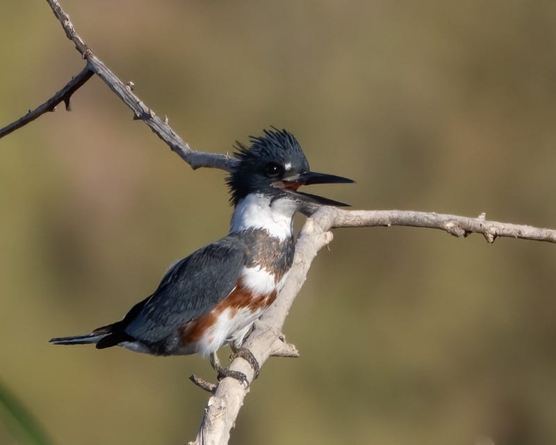 It is said that you can hear a Belted Kingfisher long before you might see it. They will make their rattling call in flight and while perched. It is a unique sound and can be made for any number of reasons including as a territorial warning, an alarm call, contact between mates, or even just an excited call indicating they see a fish and are heading after it. You can hear a soft call at this link but louder calls may be heard across a body of water from a distance of hundreds of feet.
