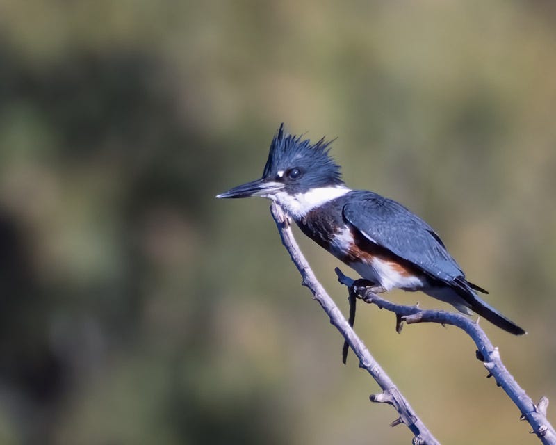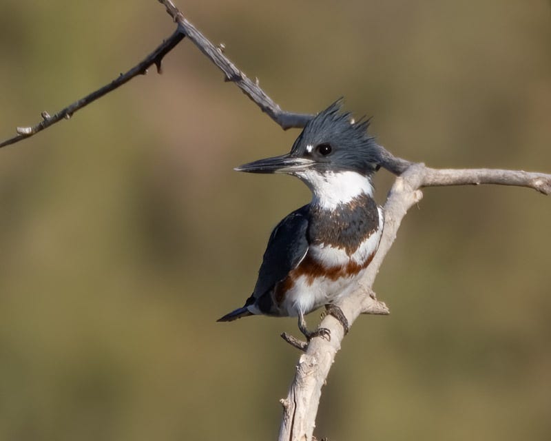 This is a female Belted Kingfisher. Unlike many other bird species, it is the female Belted Kingfisher that is more colorful than the males of the species are. Both the male and female Belted Kingfishers have a blue/gray band across their chest. The females have an additional rust colored band across their bellies. Scientists are not sure why this is the case but that doesn’t stop anyone from speculating.