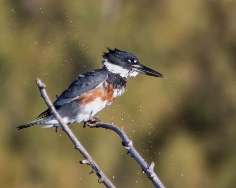 Sometimes the Kingfisher will eat its prey in flight but usually it will land on a perch before flipping the fish into position to swallow it. At some point the Belted Kingfisher will also quickly shake out the water from its feathers to dry off. Then, it will turn and resume looking for the next fish to eat. In the photo below, you may notice that as the Kingfisher is shaking its feathers, it also has the nictitating membrane engaged over its eye. No sense in taking a chance of some random flying debris hitting its eye.
