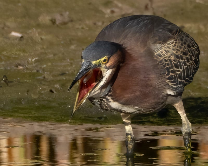 The Green Heron positioned the fish in its bill so that when it tossed the fish in the air, it would be able to swallow the fish head-first. This happened incredibly quickly. My eye was never able to see this happening in real time but the camera, focused on the Heron ahead of time and with a shutter speed of 1/2500th of a second, was able to capture the moment. Who knew that the Green Heron’s mouth was so large??? The fish below curled into a circle as it floated in the air.