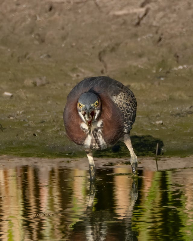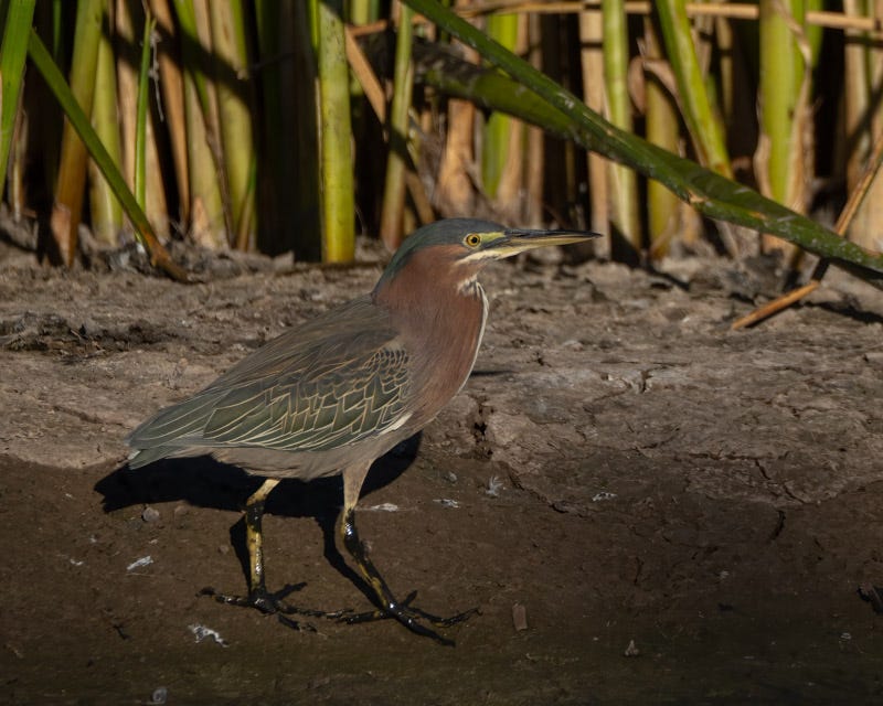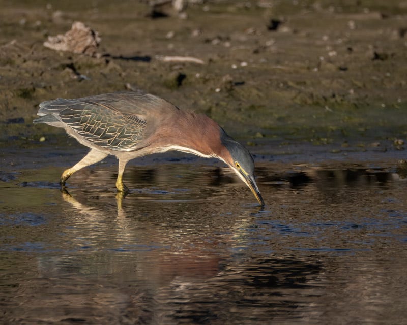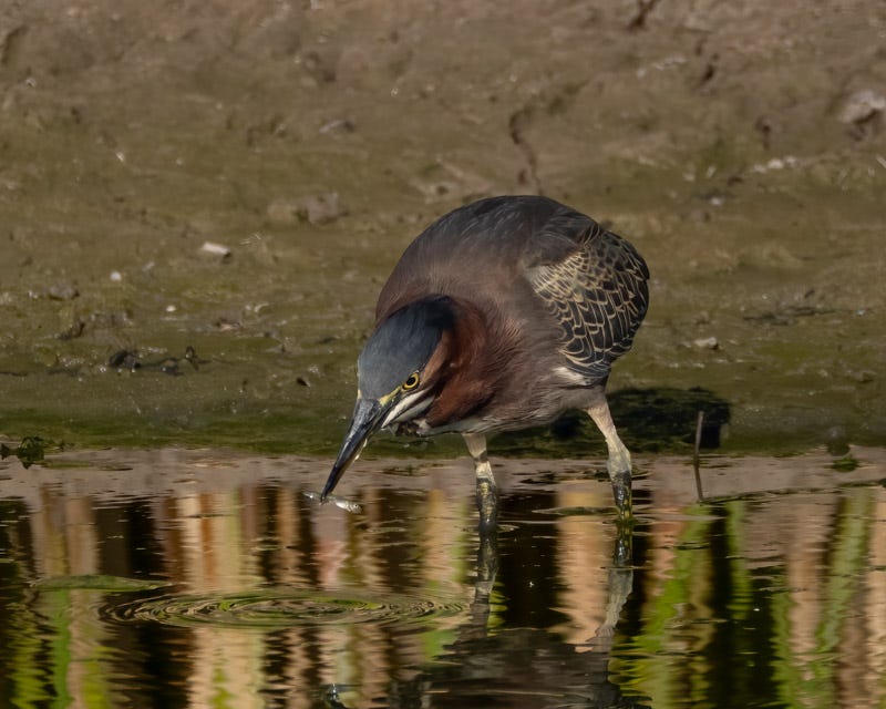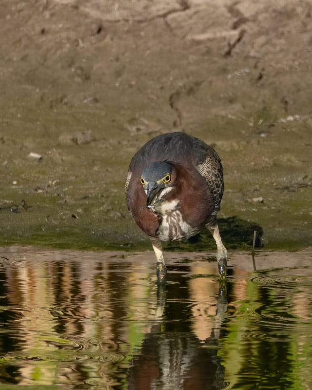 Because the water had receded so much, all of the remaining fish were crowded into a smaller space. The Green Heron stood still in one spot, catching fish after fish without having to move. To have the best lighting, I stood with the sun directly behind my back and the Heron directly in front of me. From that angle, I was facing the Green Heron straight on and his body looked like a butterball. He did catch a fish!