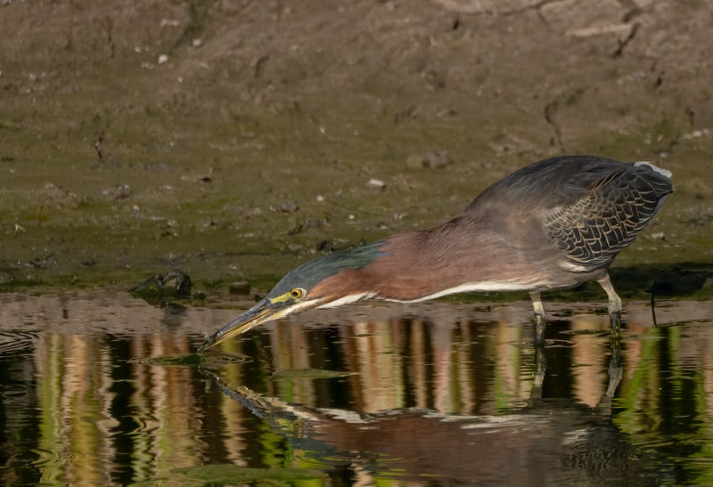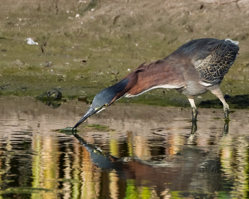 Smaller than Great Blue Herons and Great Egrets, the Green Heron might measure 18” from bill to tail. It looks stocky compared to the long look of the larger Herons and Egrets and may only weigh up to 8 ounces (a half of a pound). The Green Heron has a chestnut colored neck and breast with a greenish back and wings. Its legs are muddy because it had just stepped out of the water.