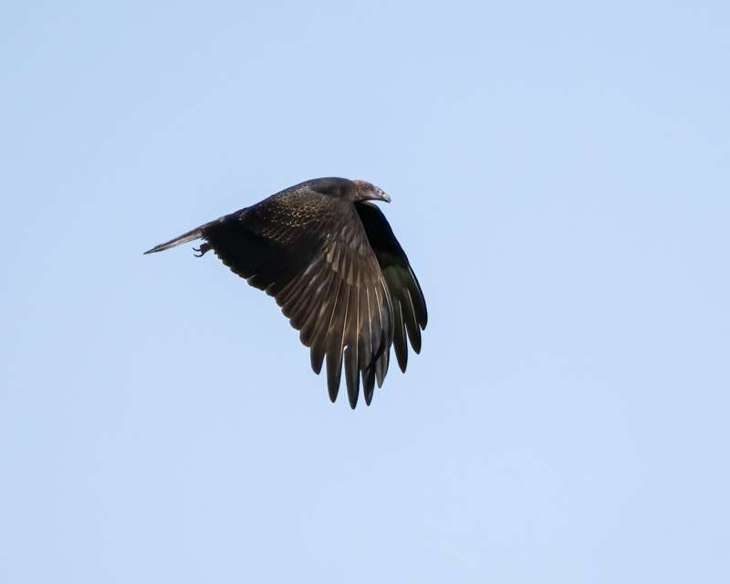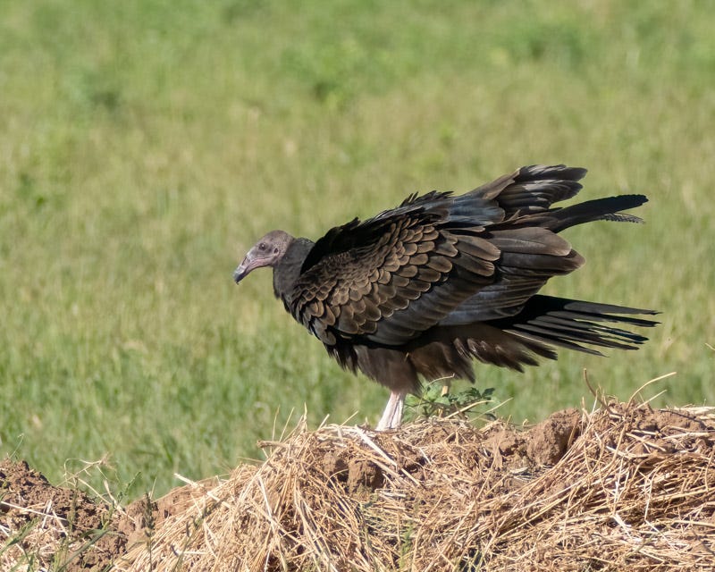 The Turkey Vulture made a big rouse, shaking out all of its feathers. This can have multiple purposes, but often is done just prior to flight to relax and settle all feathers into place. I waited for the bird to act! By the way, notice the white legs of this bird. Turkey Vultures have pink legs. The white color is due to dried uric acid. Turkey Vultures defecate on their legs as a cooling mechanism resulting in cooler legs which then become colored in white.
