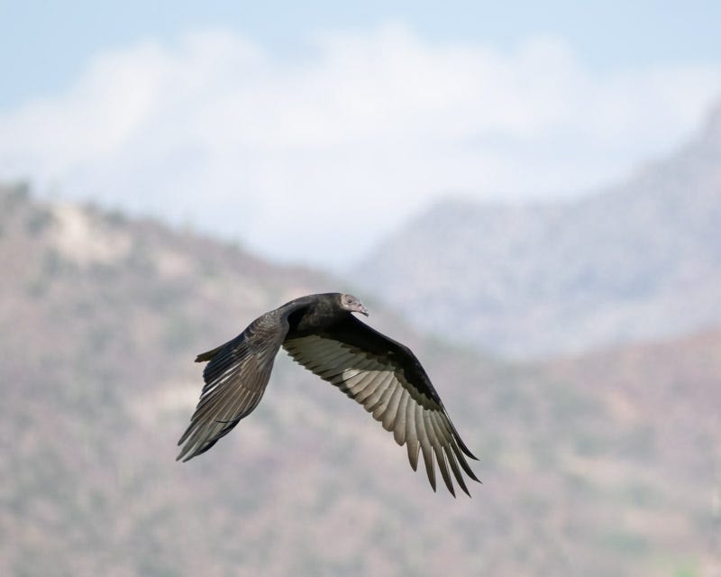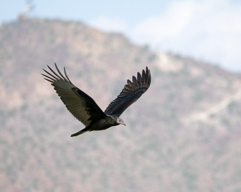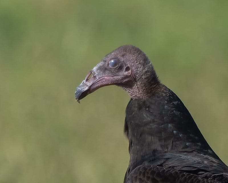 Upon closer inspection you can see that this TV's head is beginning to turn red. The gray head begins showing some pink towards the end of the bird's first summer. By next summer its head should be bright red. Notice the color of this Juvenile Turkey Vulture's bill. It is black. An adult Turkey Vulture will have a pale bill. This young bird's bill is just beginning to turn white at its base. Again, this change will occur during this next year. This photo also shows us the nictitating membrane over the bird's eye. Birds have a third eyelid, called a nictitating membrane. This eyelid moves forward and backward. The TV's other two eyelids move up and down in expected fashion. The nictitating membrane is translucent and serves to protect and clean the eye and keep it moist while the bird is still able to maintain clear vision.
