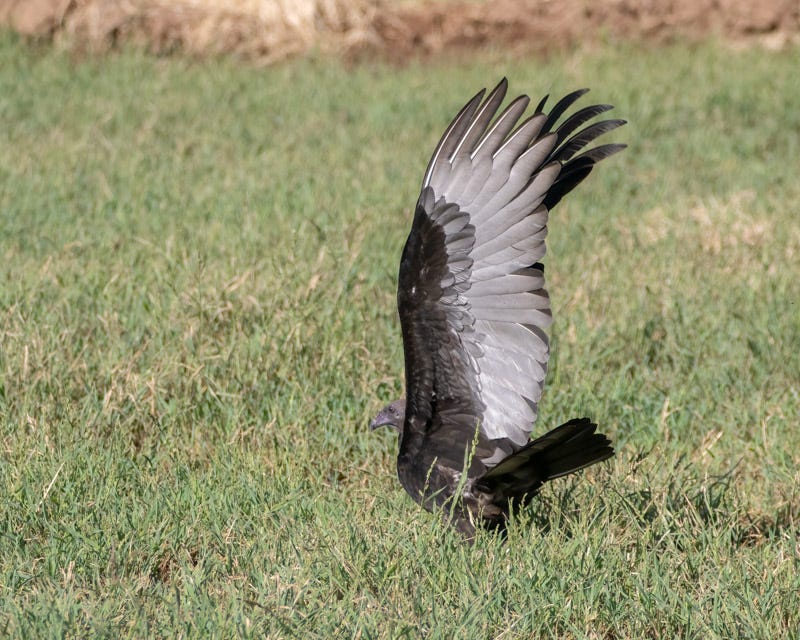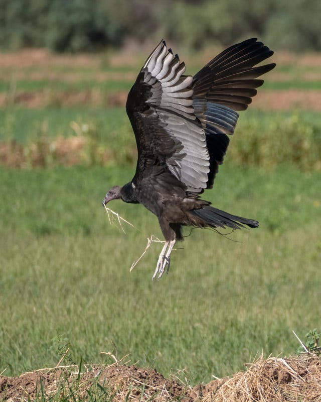 Rather than flying, the bird hopped forward and examined the ground closely. After a few attempts it picked up a long dried piece of vegetation and then took off. I'm not sure what the TV planned to do with its prize. Turkey Vultures do not build nests. Perhaps the Turkey Vulture was just exploration and play, or practicing picking and carrying objects. Only that bird knows for certain.