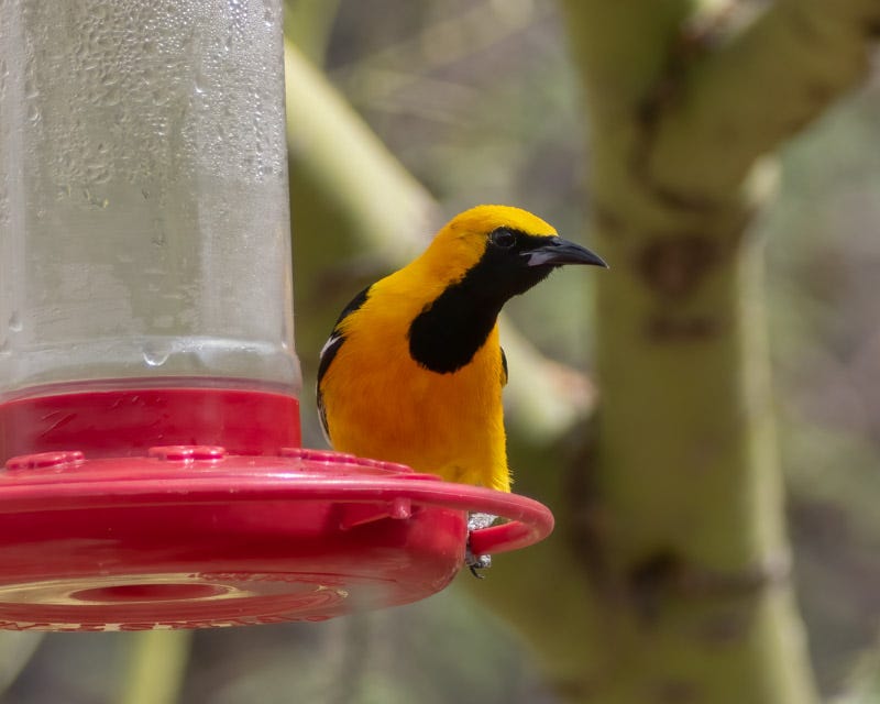 A friend living one block away tells me he has a Hooded Oriole nesting in one of his palm trees. Sometimes when I'm on the back porch I can see the male Hooded Oriole arrive at the oriole feeder during the day. Oriole feeders will have bigger openings than typical hummingbird feeders in order to make it easier for the orioles to drink from. This is another shy bird. It rarely hangs around before or after drinking. When finished, it will dart back through the desert in a path straight towards my friend's house.