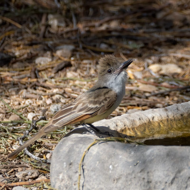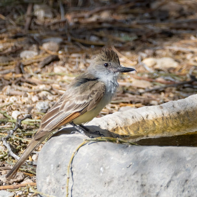 Brown-crested Flycatchers breed in the southern Arizona desert. I have them in my neighborhood although I haven't been able to find this year's cavity nest(s) in the area saguaros. Still, I can hear the Flycatchers early in the morning and late in the day. Often, one of the Brown-Crested Flycatchers will come in for an afternoon drink.