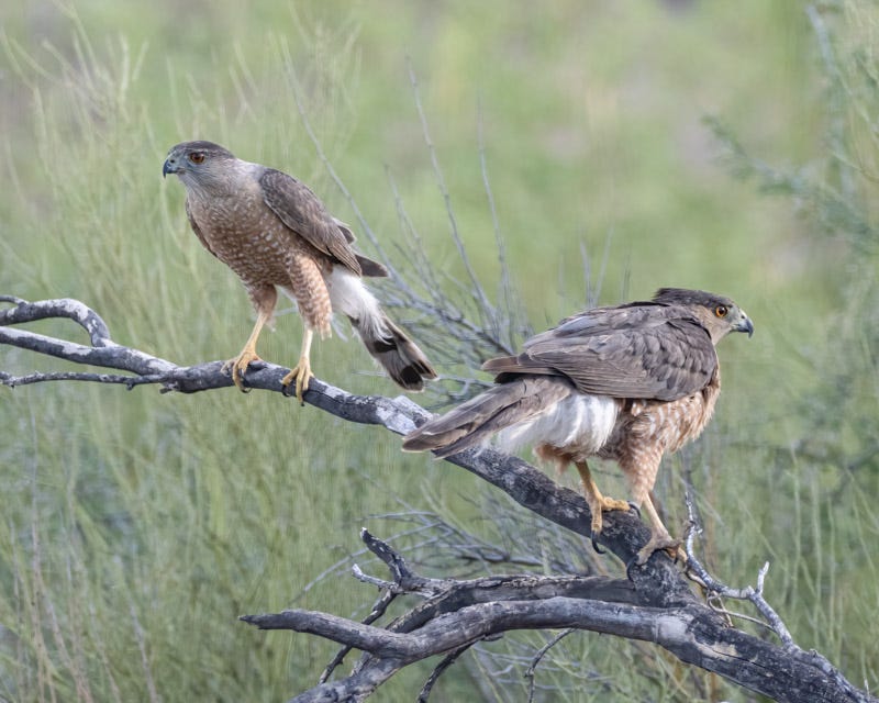 But then a second Cooper's Hawk arrived. It looked much larger than the first and so I assumed that the second bird was a female and the first bird a male. They remained side-by-side for just a few seconds and then both birds flew off.