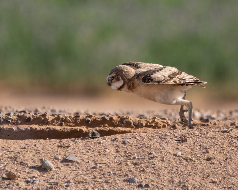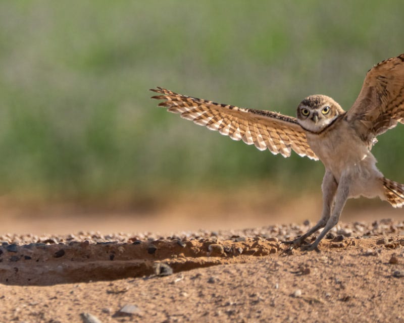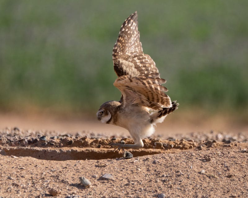 The Burrowing Owl decided it was a good idea to go back underground and dove towards the burrow entrance.
