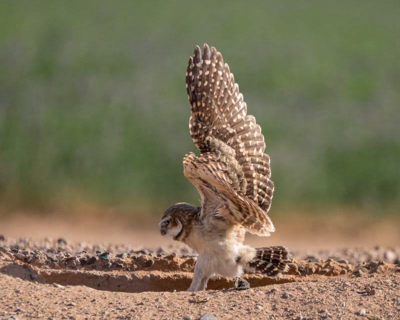Wings up and tail spread, the owl dropped into the burrow and then disappeared.