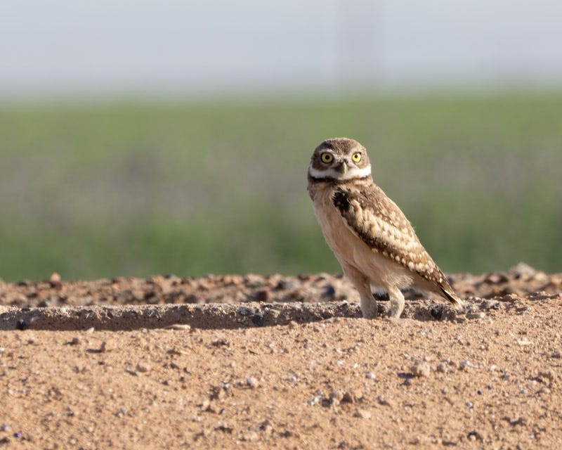 I am familiar with some Burrowing Owl families who live near farmland in Pima County but a friend told me about another family up in Pinal County. We took a drive of well over an hour to get there and found the burrow among vast fields of farmland in otherwise wide open desert flats. There were several young owls there when we first arrived but most ducked down into the burrow as soon as our car stopped. One very curious young owl remained to check us out.