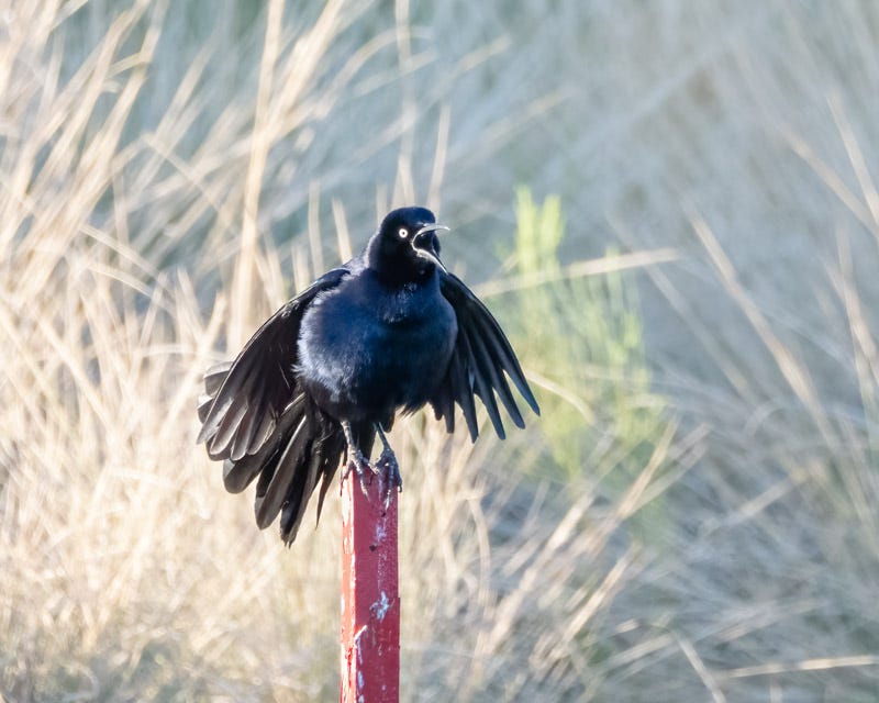 The five of us met last Monday morning and began our Birdathon field trip at 5:51 AM, just after sunrise. That is when the birds are waking up and actively looking for breakfast after resting during the cool night. In over 4 hours of moving at a slow, 'birding' pace, we covered three miles of rolling and uneven paths. We spent our time along a golf course that we have permission to bird at monthly. During the morning we saw 52 species of birds. Great-tailed Grackles were loud and actively announcing their territories and working to attract their mates. Many were seen flying with reeds to build nests with. This Grackle was calling as loudly as he could!!!
