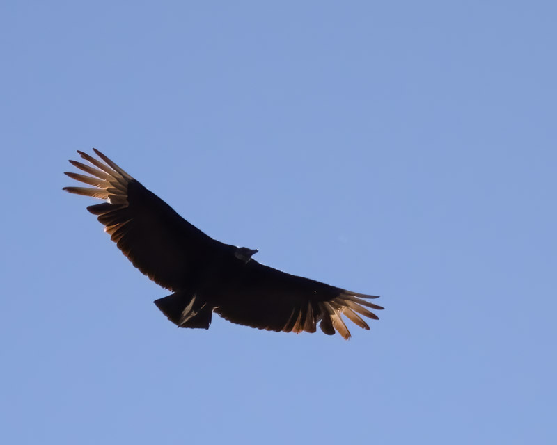 As we were leaving the course, three Black Vultures soared overhead. These vultures have a different profile than the more widely seen Turkey Vultures. They have broader wings and a short tail, but the white fingers on their wings are a tell-tale feature.