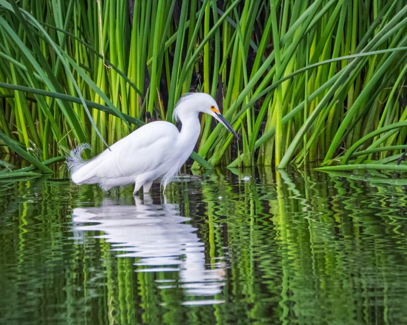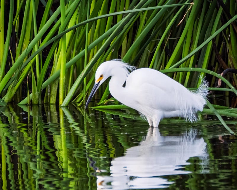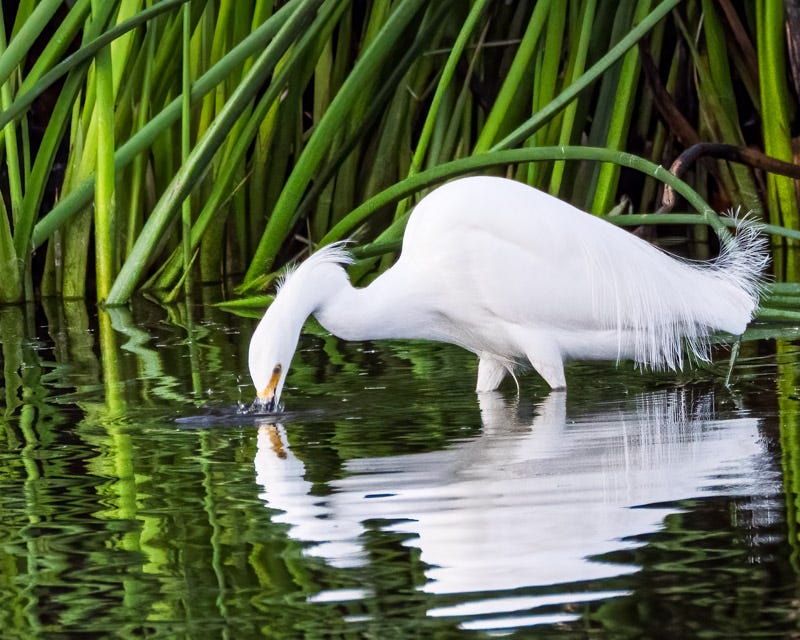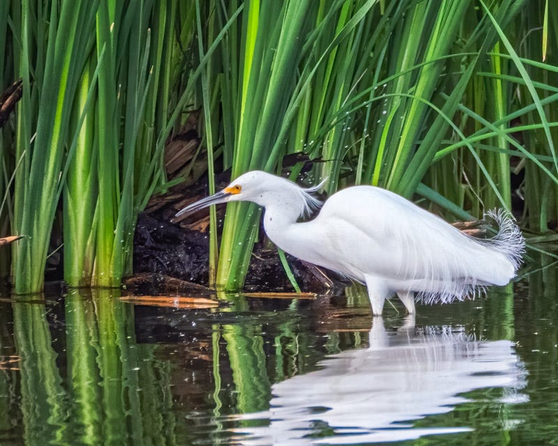 Over the following two weeks I made a few more trips back to Sweetwater. Each time I was able to see a Snowy Egret there, and I assume it was the very same bird. Often it was in the same corner of the same pond it had been preening in. It also had a few other regular spots. On one visit, I got to see the Snowy Egret hunting for prey.