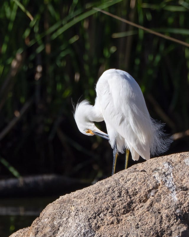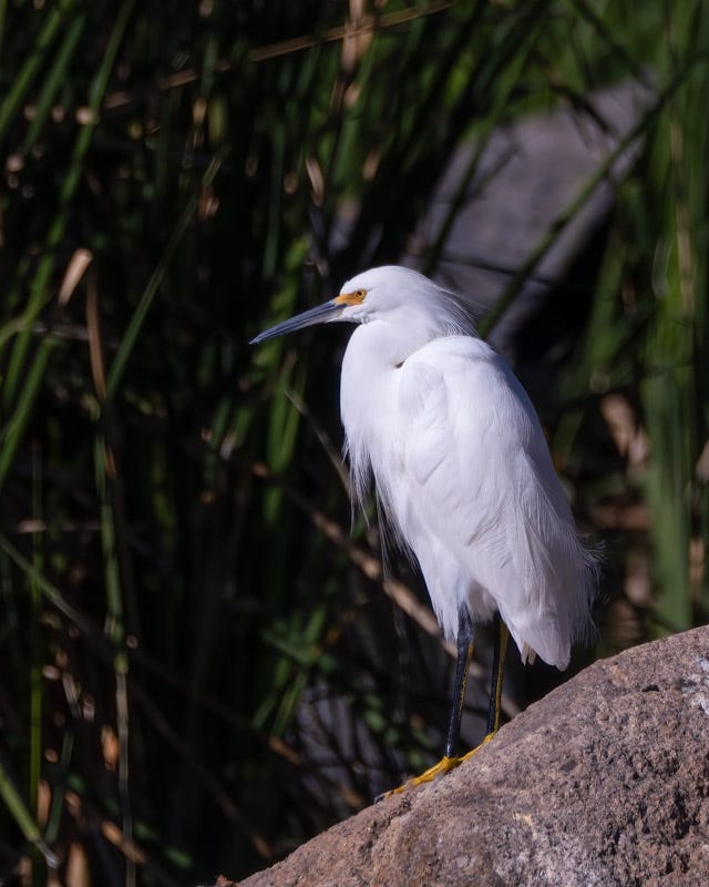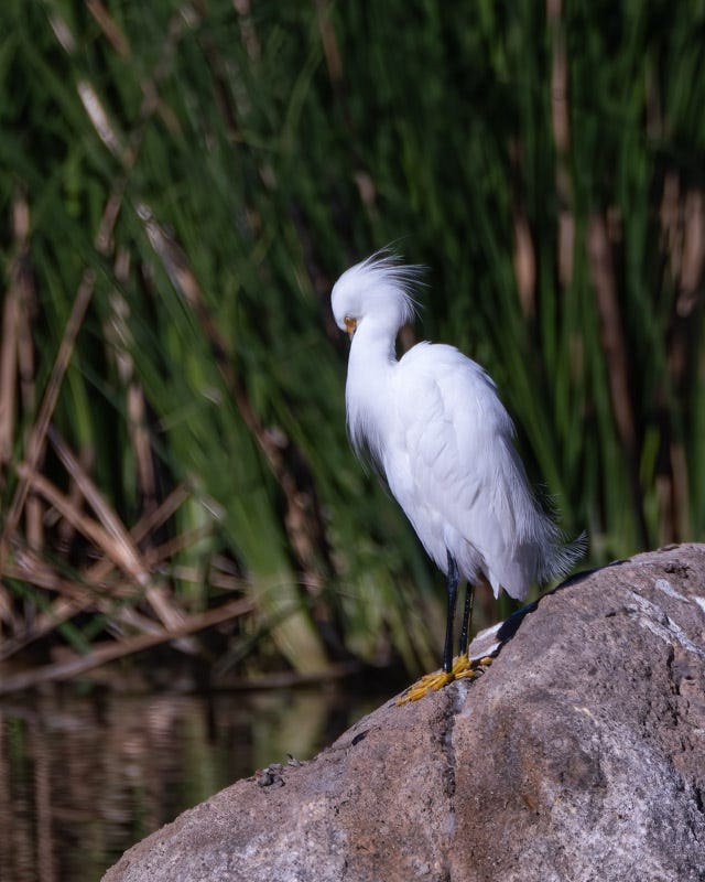 One morning at Sweetwater Wetlands, I came across a Snowy Egret perched on a rock in the middle of a pond.