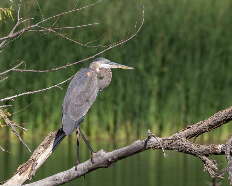 Later, on another side of the Preserve, a Great Blue Heron was perched on a dead tree. If you look at the previous photo and the following two photos, you can see these large wading birds in their typical poses. They stand tall and have long, S-shaped necks. Birdnote shares more on this large bird.