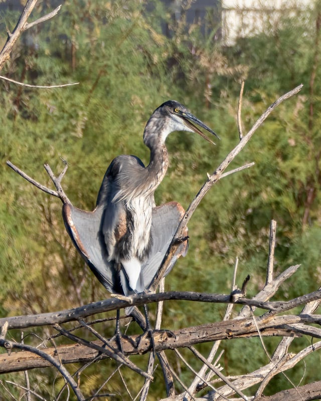 The town of Marana recently sponsored a Dragonfly and Damselfly walk at El Rio that was led by Jeff Babson. I signed up for it knowing what a great educator Jeff is and looking forward to learning a bit about other members of our desert wildlife. When I arrived at El Rio at 7 AM, I saw that there were six Great Blue Herons there! That's a large number of those very large birds. The first one we saw was trying to cool off in the already hot, early morning sun!!