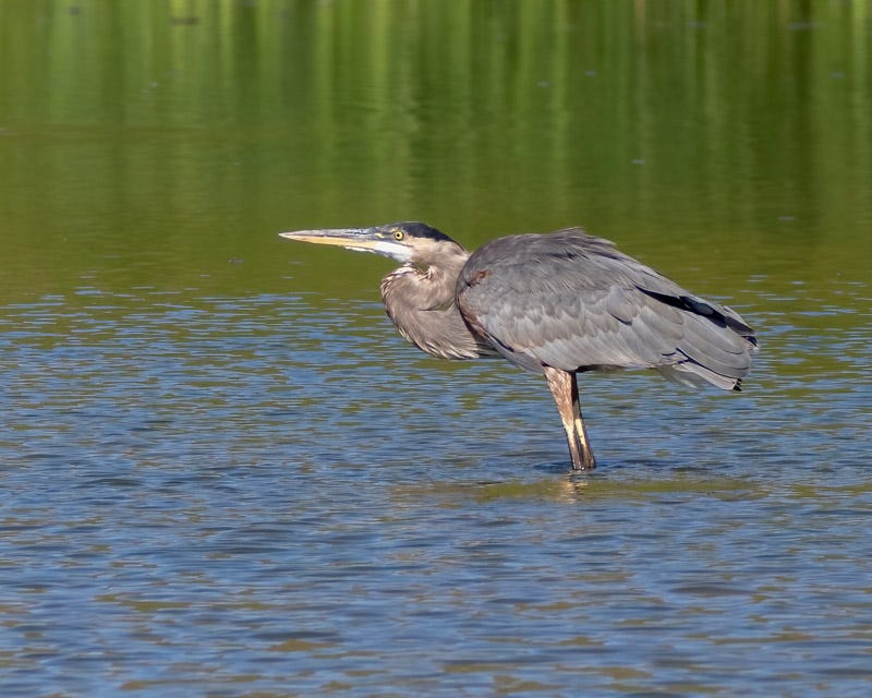 After a short while this bird flew down to the water. It seemed as if the water level was lower than usual, making the entire preserve a better place for these big wading birds to find food. Great Blue Herons are America's largest herons, measuring 3 to 4½ feet long, beak to tail. I could not find any definitive information on the length of a Great Blue Heron's legs but one estimate places its legs at 16" - 20". The water was shallow all across the preserve and this bird was belly deep in the water.