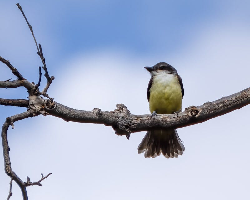 There were three young fledglings. These young Thick-billed Kingbirds had a more yellow belly than the adults, and did not have the black head and white face of the adult. The fledglings were off the nest but remained on the nest tree, waiting for one of the parents to bring them food. The adult Thick-billed Kingbirds did their job well. At one point the adult returned with a nice sized cicada!