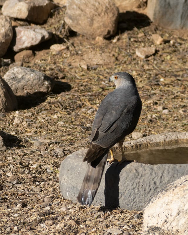 Some birds prefer drinking from the water on the ground. Apparently the Cooper's Hawk will use either source. This photo shows how long a Cooper's Hawk is. From the tip of its bill to the end of its long tail the hawk is about 15" long. Adult Cooper's Hawks have gray backs and an orange or red iris.