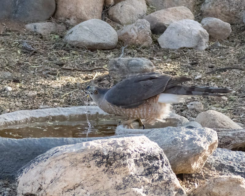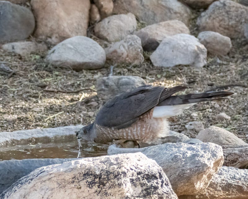 Cooper's Hawks, like most other birds, cannot swallow water the way you and I do. They do not have lips or cheeks to suck up water. These birds dip their bills in water first, and then raise their heads up.