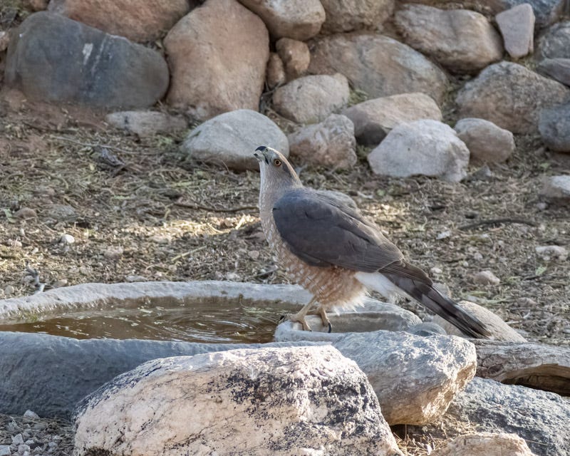 My local Coppers uses our water dish as a trap sitting in a nearby tree to watch for other birds going for a drink