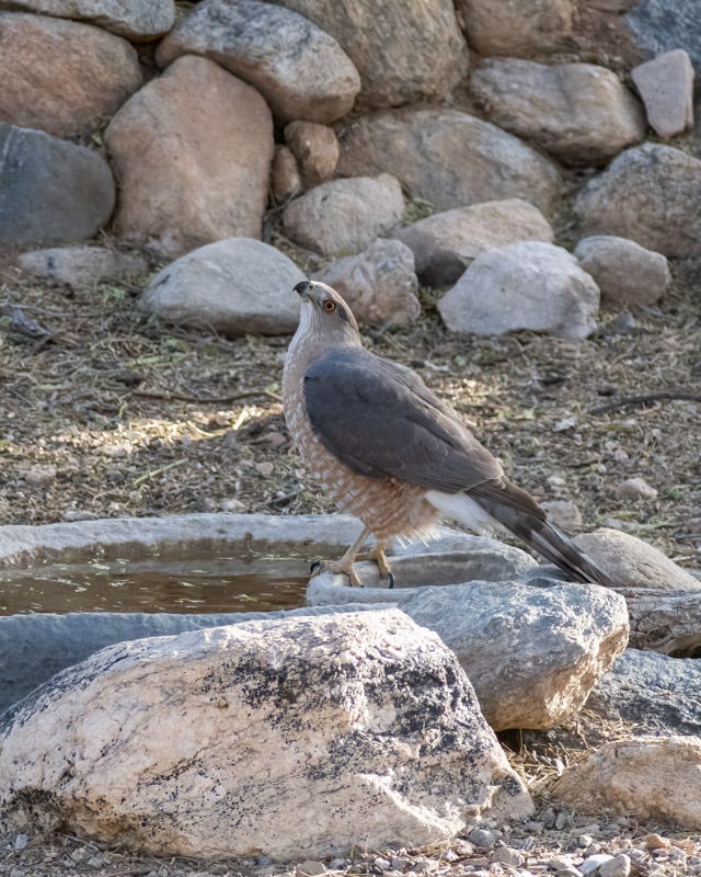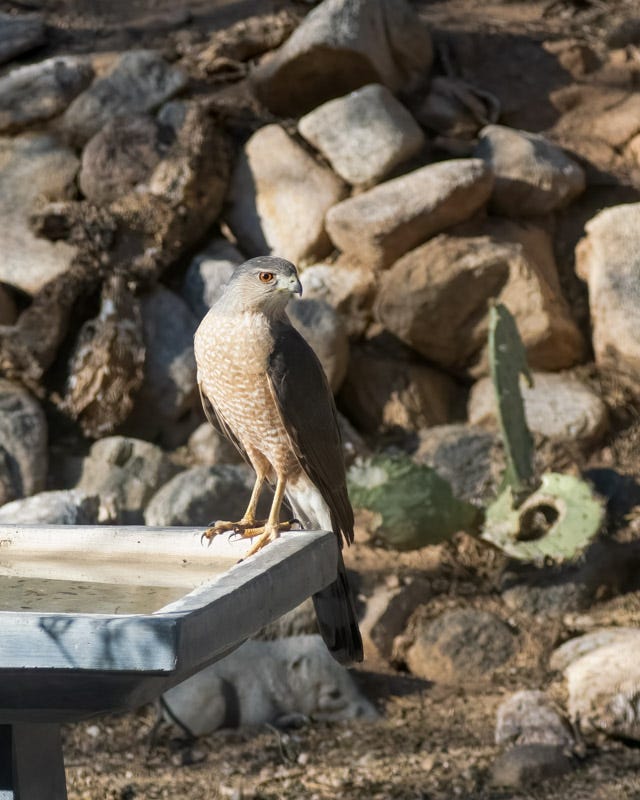 It's getting hotter now and the neighborhood Cooper's Hawk stopped by for a drink of water. Some birds prefer drinking from the tall bird bath.