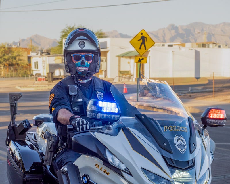 The non-profit that runs the All Souls Procession depends on volunteers and also raises funds to pay for many services during the event, including police support. Some of the officers do get into the spirit.