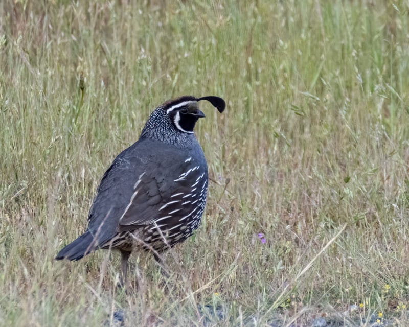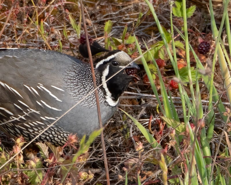 The California Quail were gorging on blackberries hidden in the thick vegetation of the prairie.