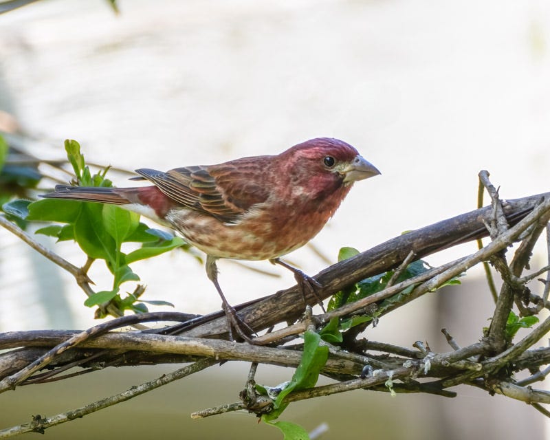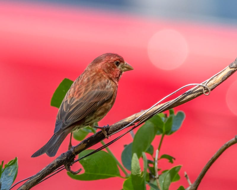 The Purple Finch remained in the shade during the time that I saw it. I moved around to try to get a better shot and here it contrasts with a bright red car in the parking lot. Purple Finches have a red back, which the House Finches do not. And the 'red' of the Purple Finch is more of a pink or raspberry color.