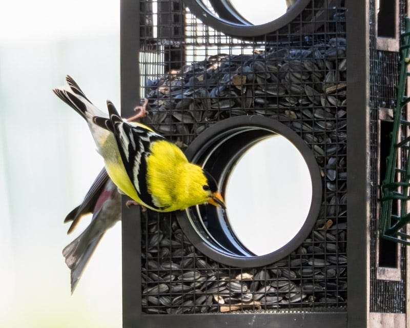 The third bird that I was very pleased to see was the American Goldfinch. I only saw it at the feeders in the Sculpture Garden. The breeding male is bright yellow, with a black cap on his forehead and black wings with white markings.