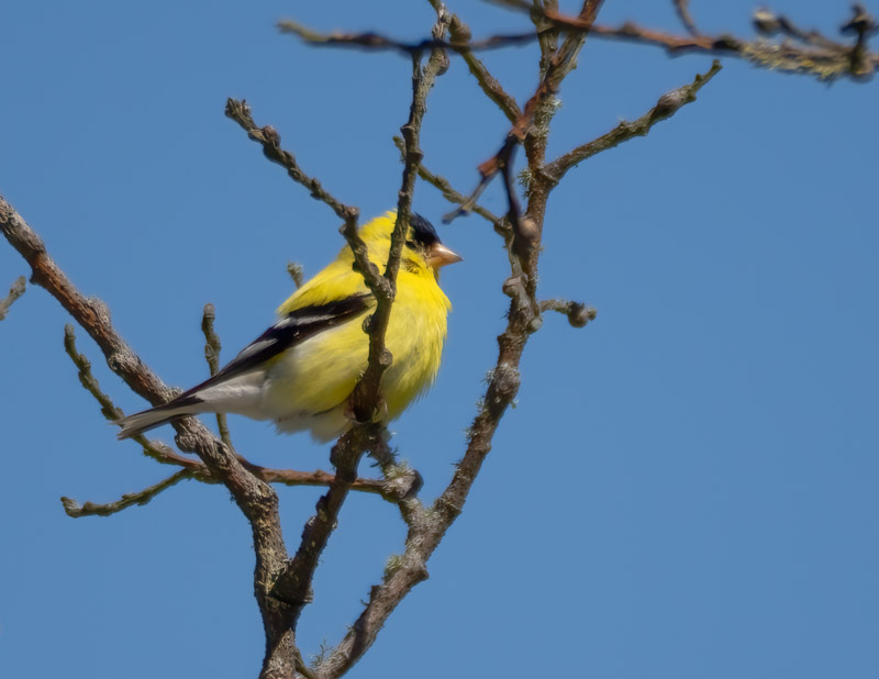 At False Bay, a pair of American Goldfinches flew in and perched for a short while. The American's bright yellow body and black forehead really stood out against the blue sky.