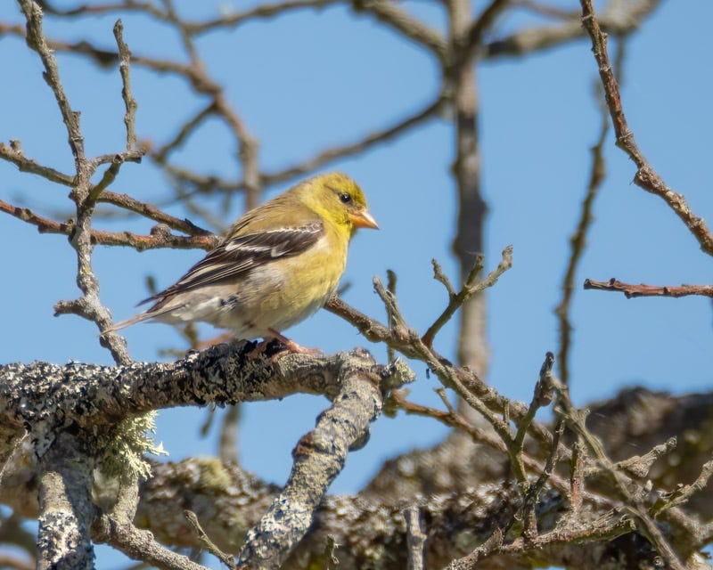 The female American Goldfinch was perched in the same tree as the male. As is the case with many bird species, the female has a much more subdued plumage than the male American Goldfinch has.