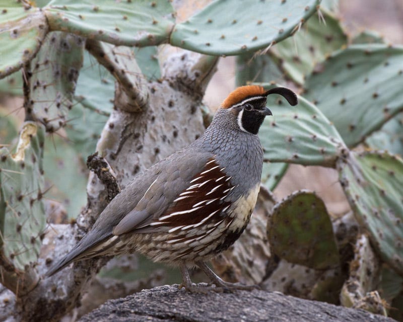 I am very familiar with Gambel's Quail, like this one from my backyard. It looks very similar to the male California Quail but with some subtle differences.