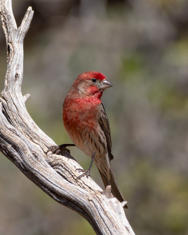 Male House Finches are red, though the brightness may vary. The Purple Finches are less of a bright red and more of a pink hue.