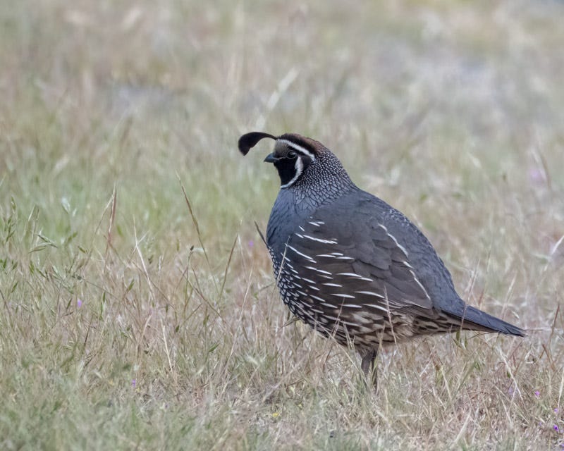 On San Juan Island I saw a few more "lifers" that were very similar to common birds in my Tucson area. I was pleased to see a few of these California Quail. They were foraging in the grassy prairie area early one morning.