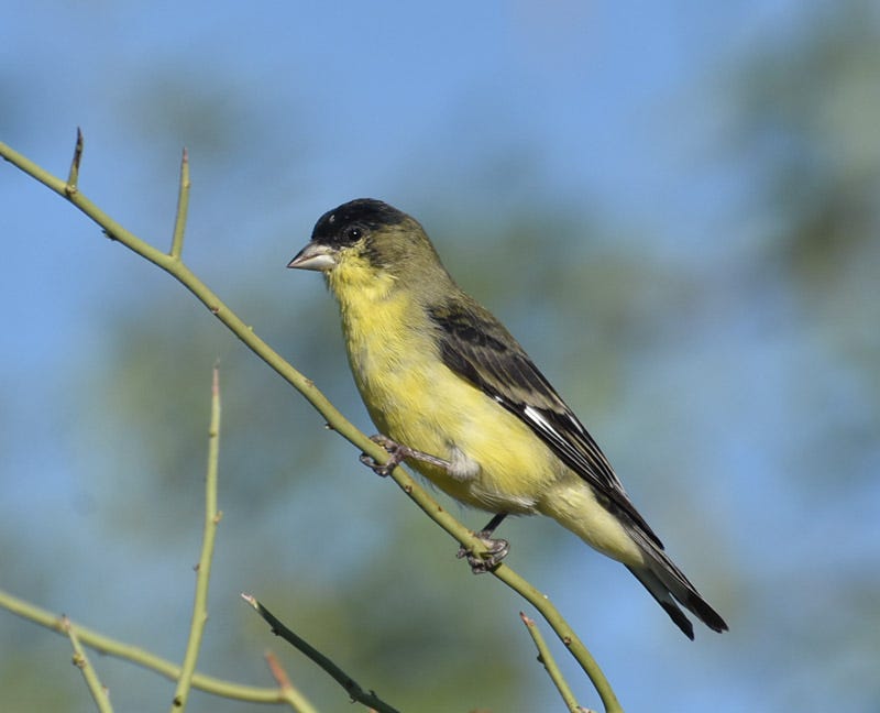 Male Lesser Goldfinches have a full black crown and do not have the bright yellow back of the American Goldfinch. Lesser Goldfinches are a bird of the western United States, but American Goldfinches can be found throughout the entire United States at some point during the year.