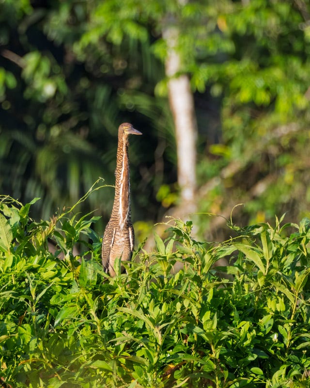 One of the nice ‘finds’ of that boat ride was a very distant juvenile Rufescent Tiger-Heron. These birds are residents from southern Mexico down through northern Argentina. They look similar to other birds in the Egret and Heron family. The Rufescent Tiger-Heron is smaller than our Great Blue Herons and Great Egrets but larger than Little Green Herons or Snowy Egrets.