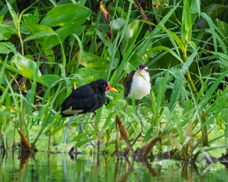 The Wattled Jacana is a marsh bird, all black with a red forehead and a red “wattle” hanging down from its face. The adult is seen here with a juvenile Wattled Jacana which has a white stripe over its eyes and white underparts. This species is present throughout the tropics and subtropics of South America and is found in just about all freshwater wetlands there. While these Jacanas look like our American Coots, they are not related at all. Convergent evolution has resulted in their similar appearance but they belong to very different families of birds.