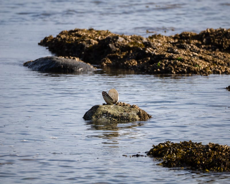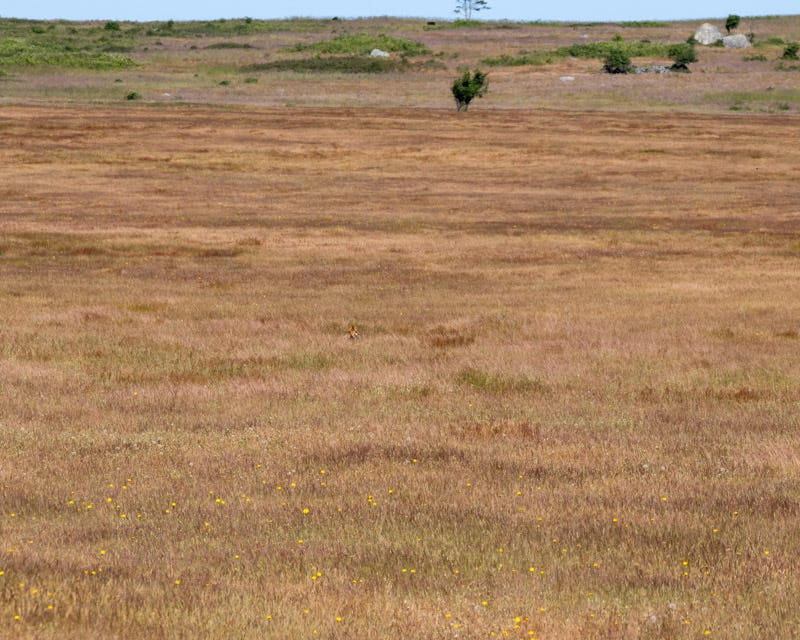 A large area between American Camp and Cattle Point is called the ‘prairie'. South Beach is just beyond that field. Sometimes foxes can be seen hunting rabbits and other prey in that area. One day we did see a fox running across the prairie. If you look closely you can see a tiny head in the middle of this photo, just to the left of the large rectangular bush. It is very tough to make out that fox in the distance. That’s the only time we saw a fox in the prairie, although we looked there daily.