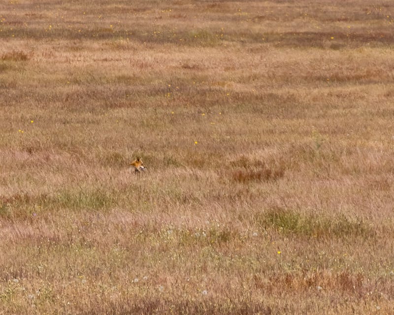 Here is a cropped close-up of the photo above. You can see the fox’s head sticking above the knee-high grasses. The grasses are high and the color of the fox’s fur helps it to blend in.