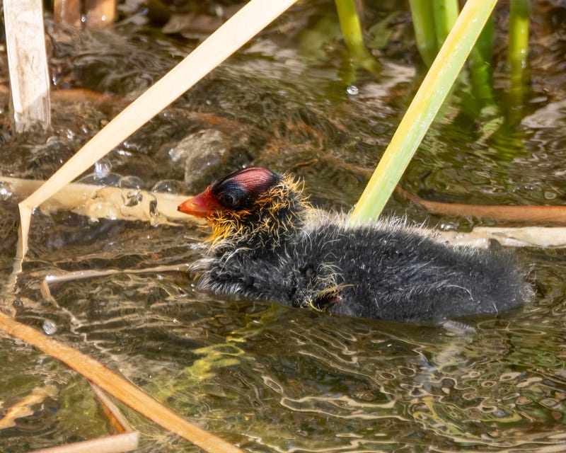 Here is a close-up of another young Coot. One 2019 article I read in The Atlantic described Coot chicks as “an aesthetic that's part drunk friar, part disheveled lion, and part tequila sunrise. Their faces and bald pates are bright red, while their necks are encircled in scruffy yellow-orange plumes.”