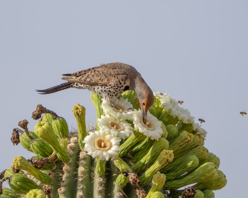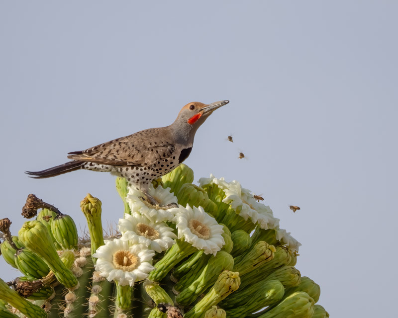 Gilded Flickers like to be on the ground eating ants, but they also eat the nectar of the saguaro flowers as well as any insects that may be inside the flowers..