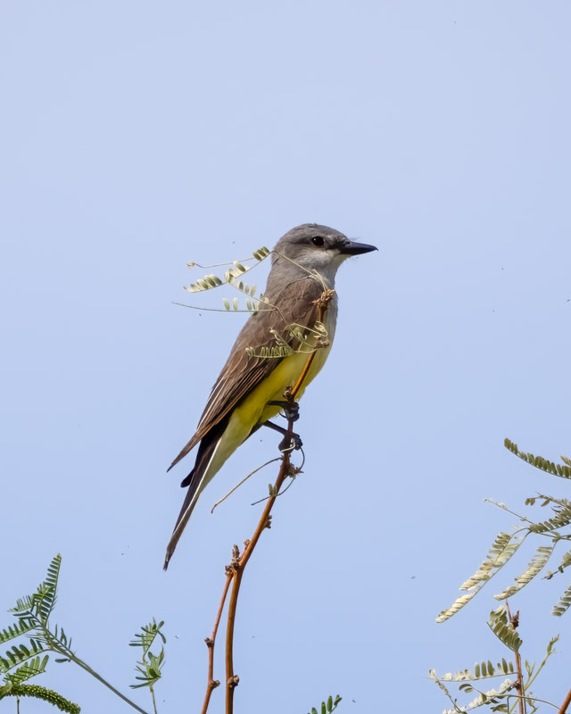 Most often, the Western Kingbirds are seen in trees, near the top, where they can look for insects to chase after. There are other summering Kingbirds and Flycatchers that look similar to the Western Kingbird. Besides the color and shape to ID this bird, the outer tail feathers are white as you can see in this shot. Those white outer tail feathers are unique to Western Kingbirds.
