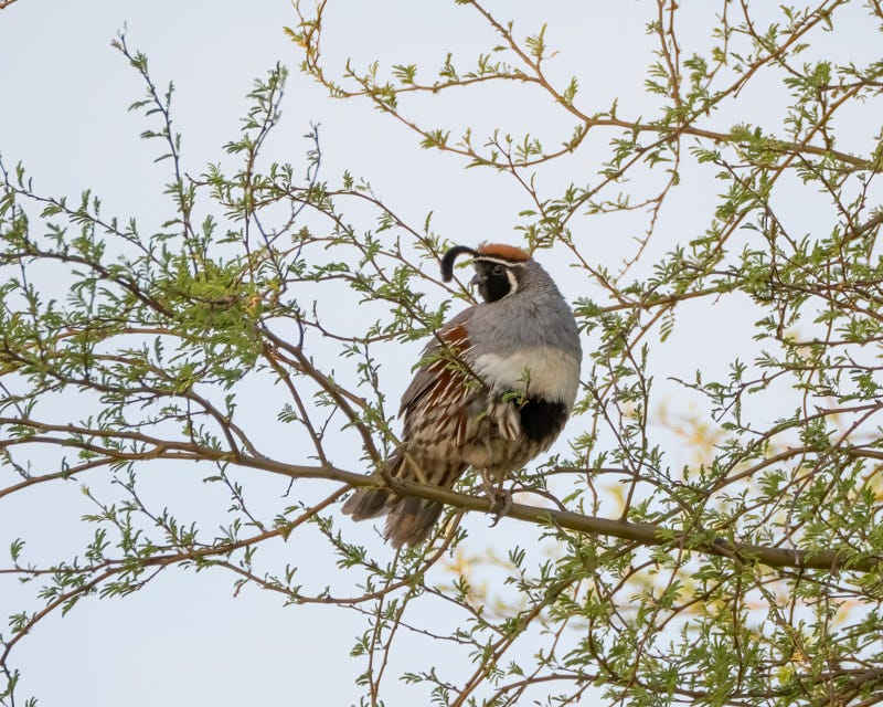 We know that Quail live on the course year round but there are months when we don’t see any. This male Gambel’s Quail was in a tree alongside the driving range. Quail are most commonly seen on the ground, but they are birds and they fly. At this time of year, the males often perch on a high spot to claim territory or watch over their family.