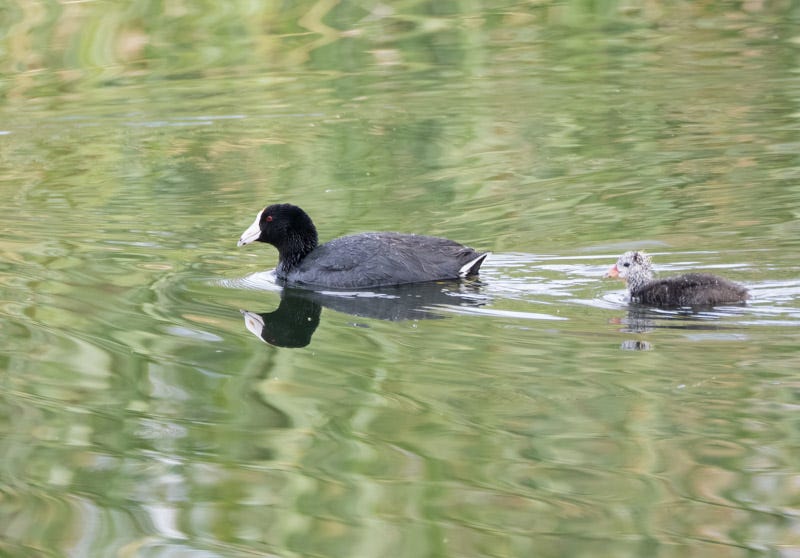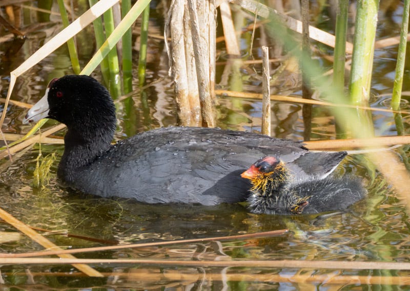 It’s nesting season and several American Coots already have young hatched. The bald head and orange fuzzy faces of these young birds look comical but serve a purpose. Usually the youngest coots are the most brightly colored. That lets the parents know they are the babies that need the most attention and support. The white fuzzy feathers on the youngster's back tells us this bird is probably less than a week old, as they begin losing those downy feathers by the fourth day after hatching.