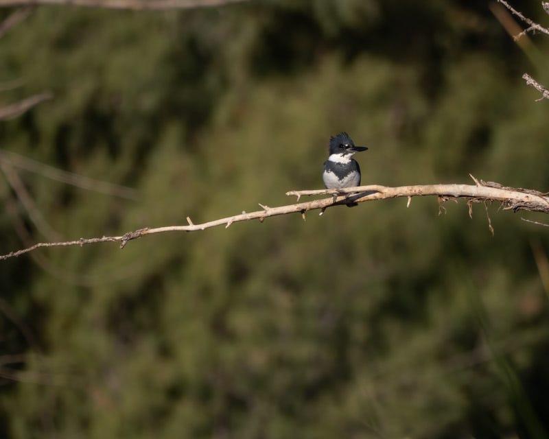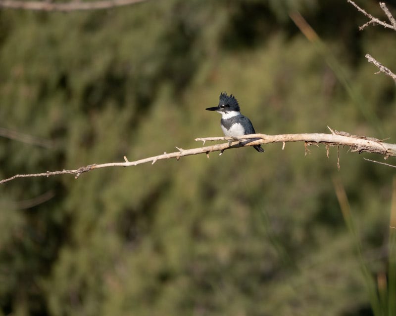 There have been a pair of Belted Kingfishers at El Rio for the past month or so. Recently I shared photos of the female Belted Kingfisher with her rusty ‘belt’. The morning I took all of this post’s photos, only the male Belted Kingfisher appeared. He would perch somewhere around the lake, and then fly into the distance towards the Santa Cruz River before eventually returning to El Rio. You can clearly see his blue necklace and see that there is no rusty belt across his front like a female would have.