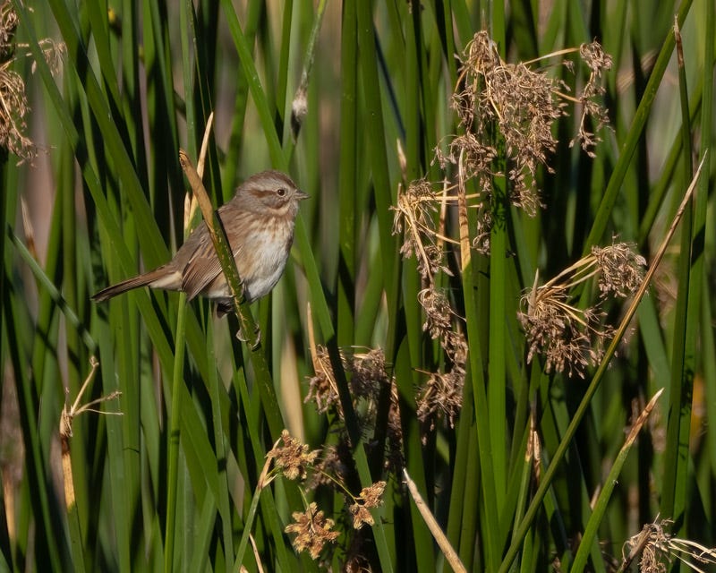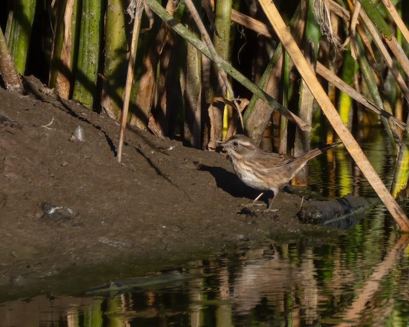 Across the water and in a dense patch of cattails, a Sparrow was hopping around. Sparrows are insect eaters but during the winter they will also eat mostly seeds. I had originally thought this bird was a Song Sparrow. I asked a friend who is a birding expert and he felt this was a Lincoln’s Sparrow. Some of these little brown birds are so hard for me and others to tell apart. For today’s post, I’ll just call it a nice looking sparrow.