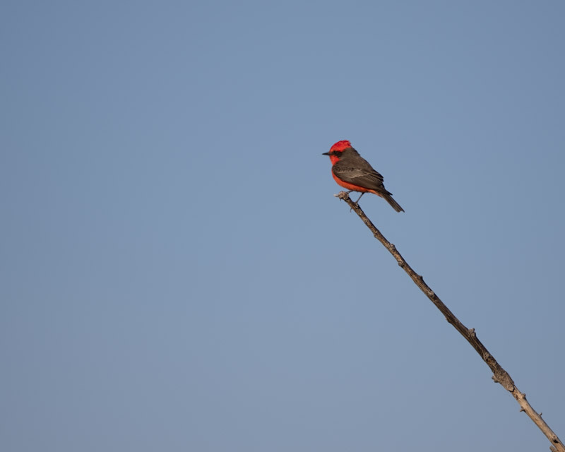 A male Vermilion Flycatcher perched on a distant dry snag. Even at a distance, the bright red color stands out. I’m not sure anyone can ever get tired of seeing these birds.
